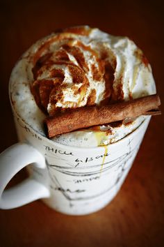 Latté se skořicí, karamelem, vanilkou a šlehačkou.