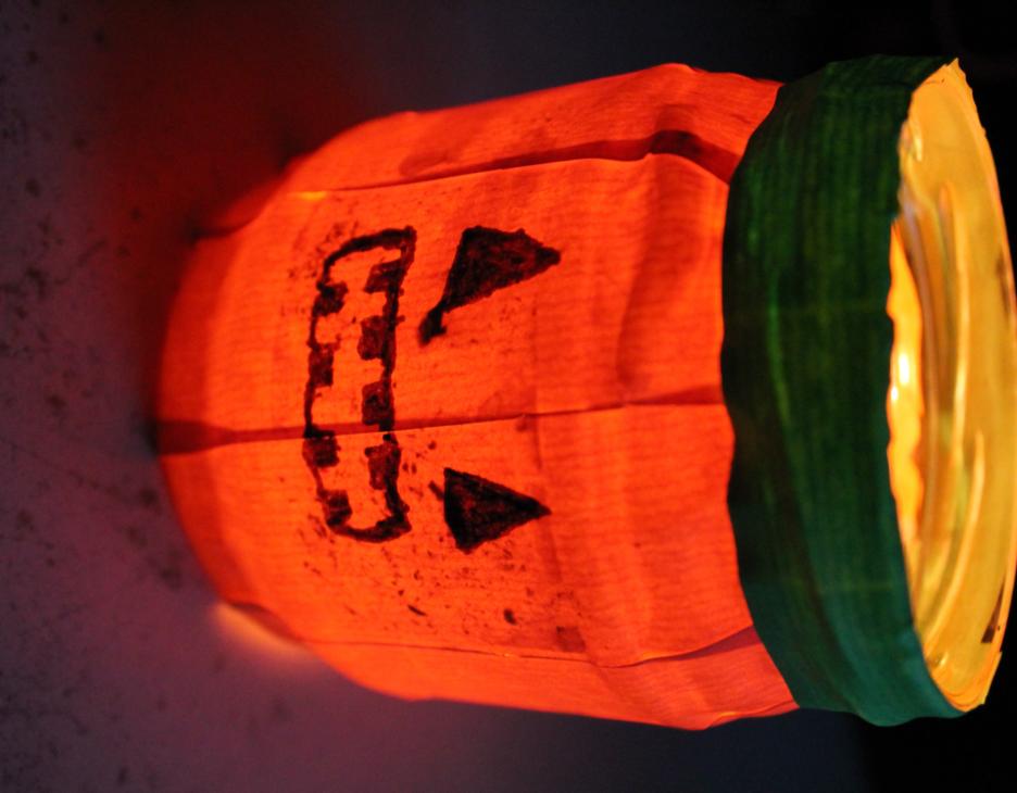 Připrav si: základní vybavení na očištění sklenic, sklenici, oranžový a zelený papír, nůžky, černou fixu, lepidlo a štětec.