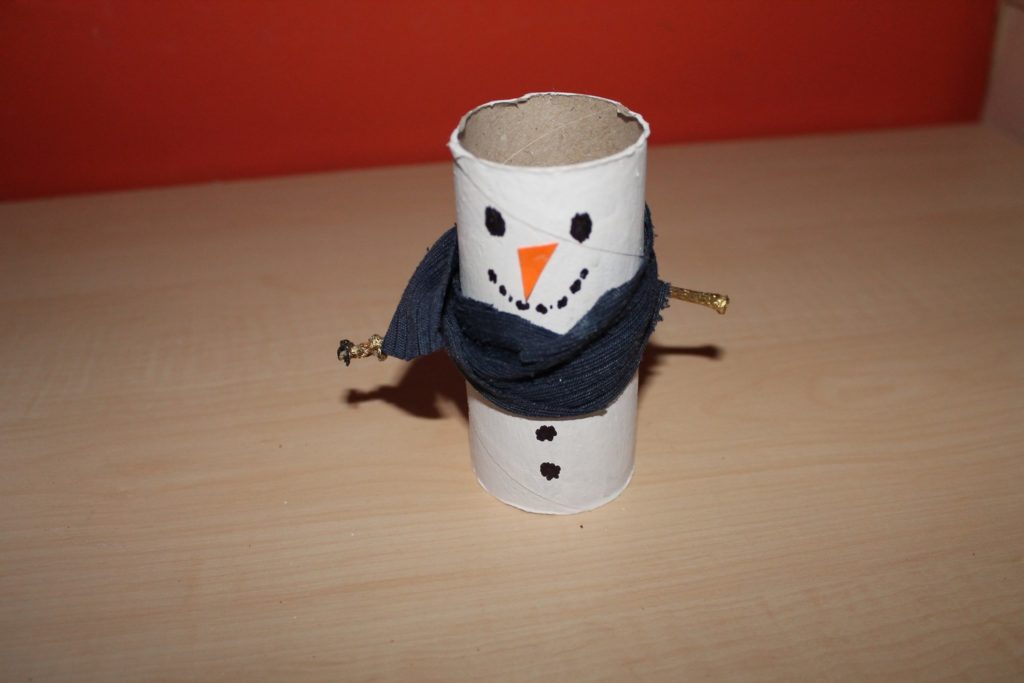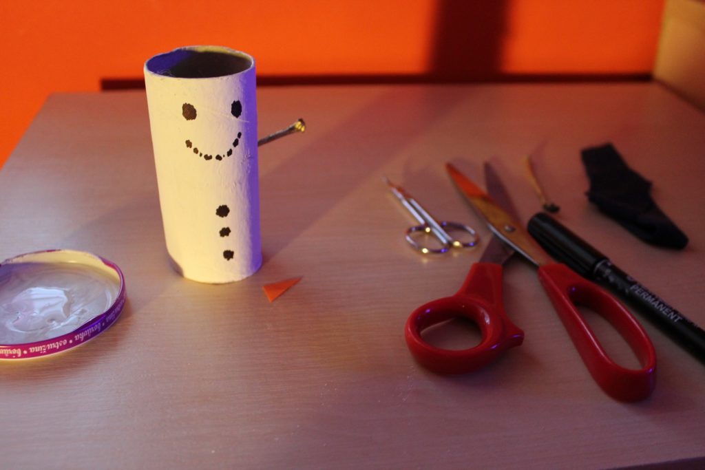 Prepare: A toilet paper roll, glue, scissors, a white tempera, paint brushes, scissors, twigs, piece of cloth, an orange paper, a black pen and a glass of water.