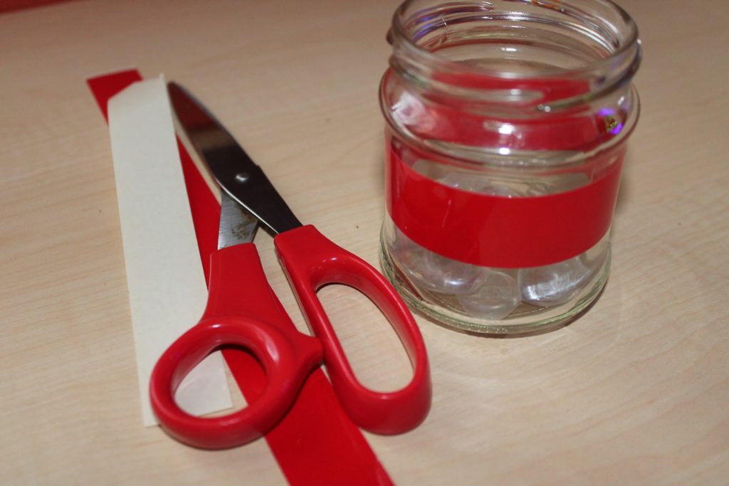 Nalep červenou lepenku a nasypej sklenice kamínky.