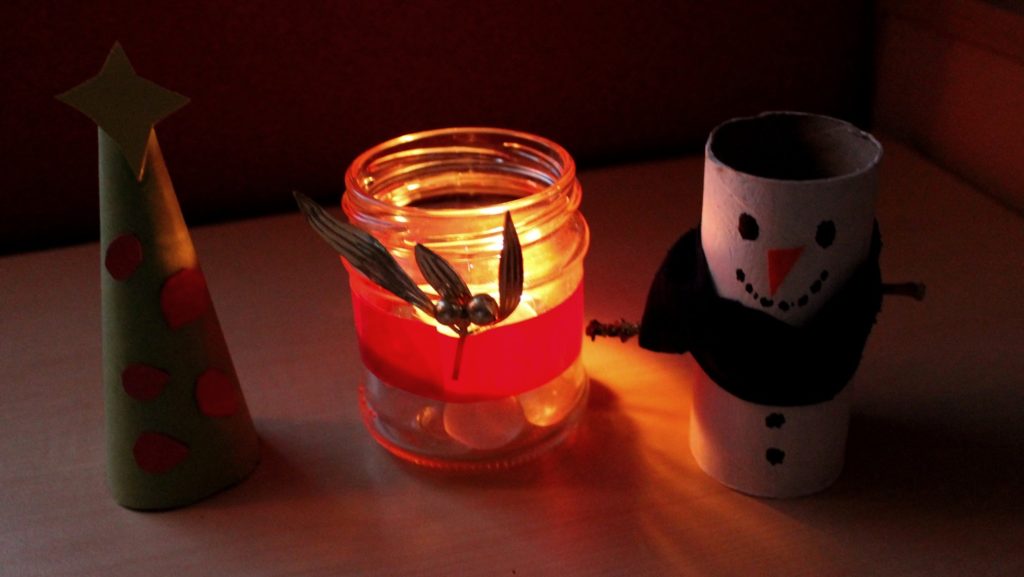 Prepare: A jar, stones, a red tape, scissors, false gold mistletoe and a tea candle.