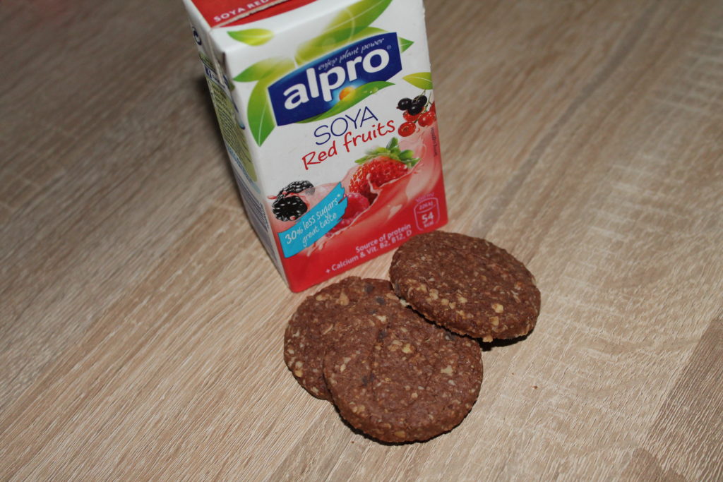 Ovocné sojové mlíčko, miska jahod a pár ovesných čokoládových sušenek.