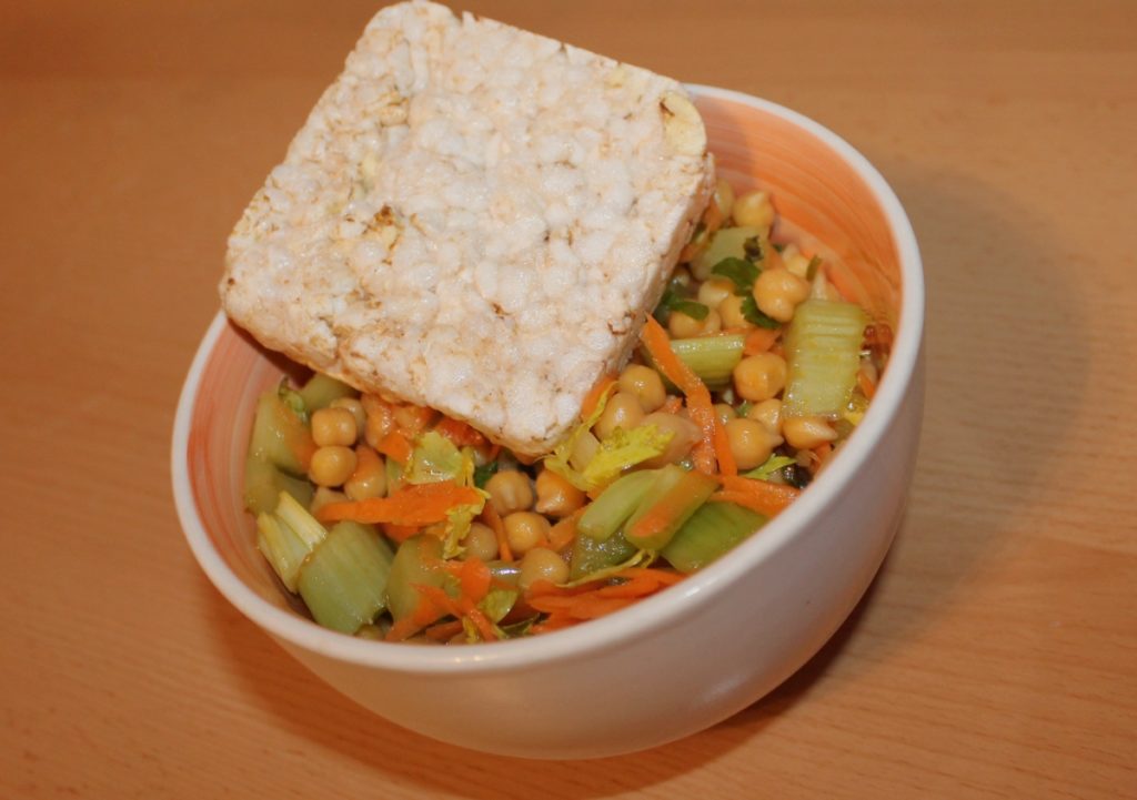 Celer a čínské zelí nakrájíme, mrkev nastrouháme a smícháme s cizrnou. Přidáme hrst koriandru, zakapeme olivovým olejem a citronovou šťávou. Osolíme a opepříme podle chuti. Podáváme s kouskem pečiva. Já jsem si k tomu vzala rýžový chlebík.