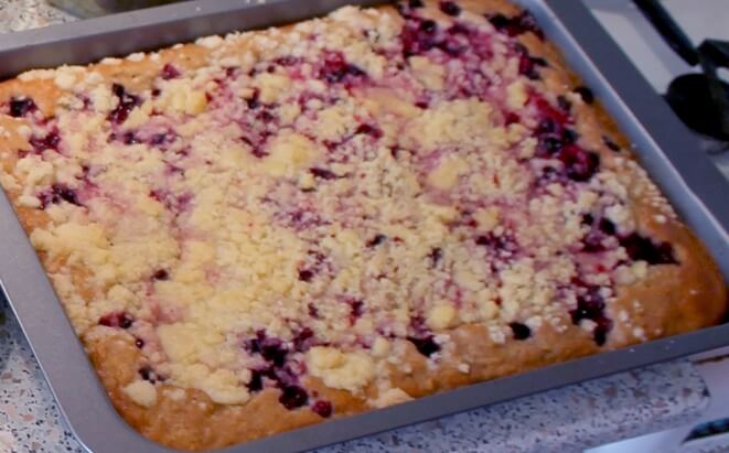 Nejdřív si připravíme těsto, které je velmi snadné. V míse smícháte suché ingredience a pak přidáte ty mokré. Vše pečlivě promícháte a necháte odpočinout. Zatím si v další misce smícháme rybíz s půl hrnkem cukru (Pokud používáte sladší ovoce, tak není potřeba sladit.). V poslední misce smícháte máslo, hrubou mouku a cukr. Konzistence drobenky by měla být sypká. Na vymazaný plech či na pečící papír vlejeme těsto, na to rozprostřeme ovoce a nakonec to celé posypeme drobenkou. Pečeme 25 minut na 180°C a pak 10 minut na 200°C. Necháme vychladnout a podáváme!