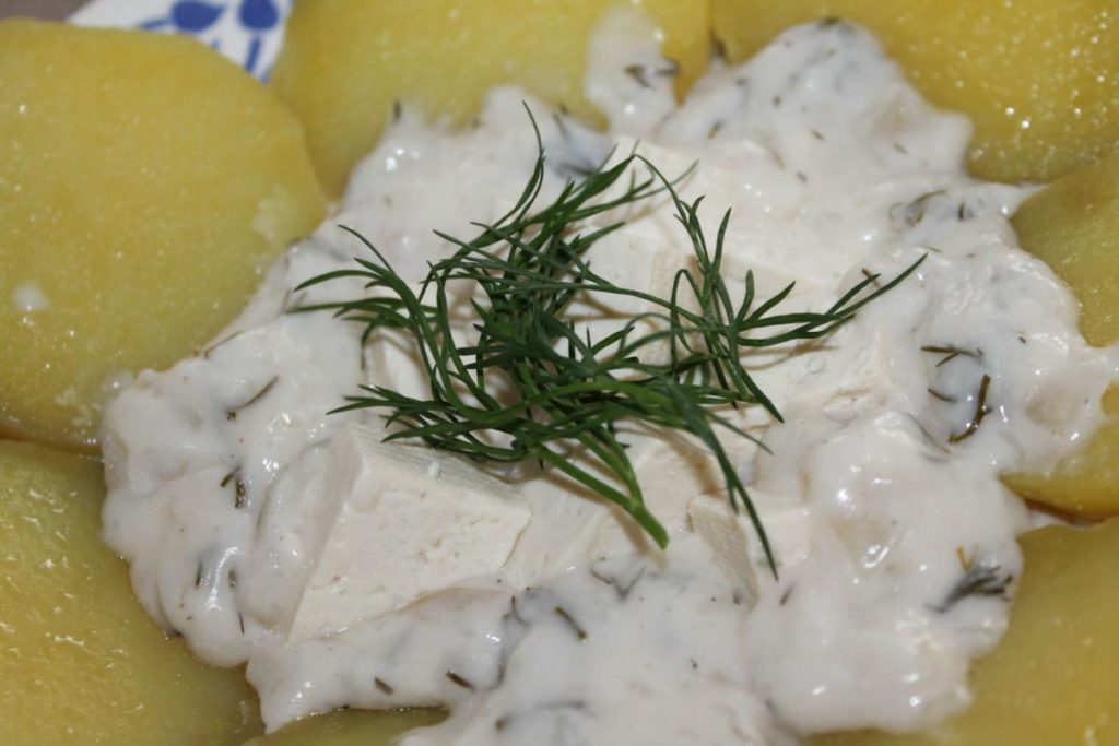 Dáme vařit brambory. Já je vařila ve slupce a pak oloupala. Tofu nakrájíme na větší kostky. V misce smícháme půj hrnku vody s lžičkou černé soli a necháme v tom tofu vymáchat. Mezitím si v hrnci na oleji osmažíme zlehka na drobno nakrájenou cibuli. Přilijeme veganskou smetanu, půl hrnku vody a na drobno nakrájený kopr. Dochutíme solí, pepřem a octem podle vlastní chuti. Necháme 5 minut probublat. V 4 lžících vody rozmícháme lžičku škrobu a za stálého míchání přilijeme do omáčky. Necháme 5 minut provařit. Tofu osušíme ubrouskem. Na talíř nandáme brambory, zalijeme omáčkou, nahoru položíme pár kostek „vajíčkového“ tofu a ozdobíme snítkou kopru.