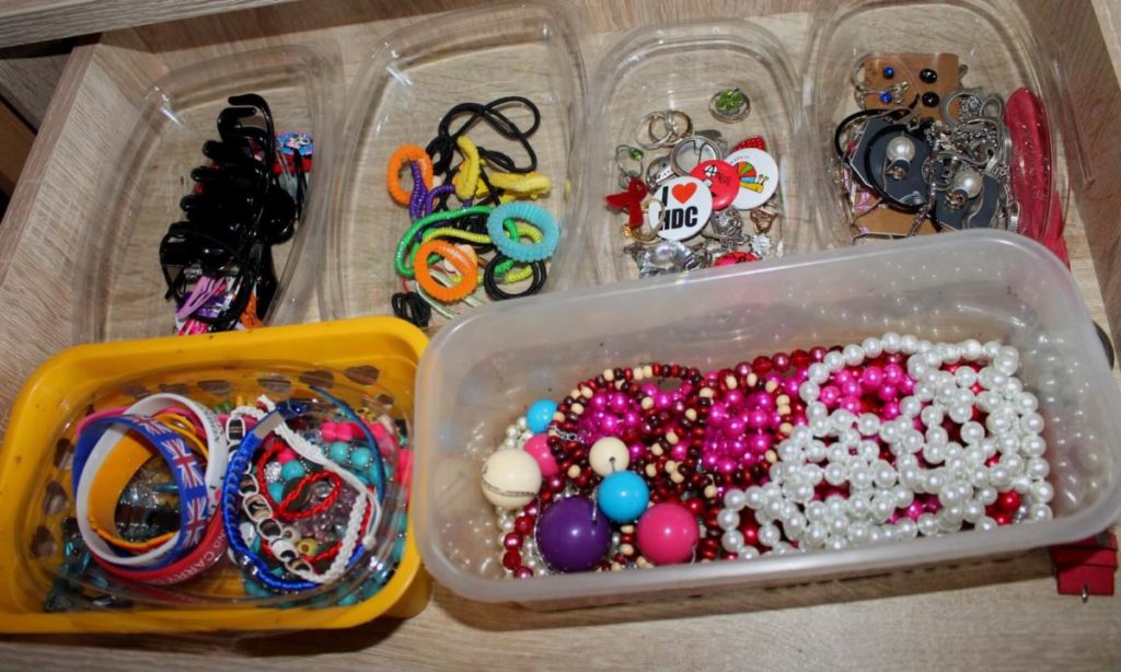 V levém šuplíku mám hlavně šperky. V horní misce zleva jsou sponky, v další gumičky, pak odznáčky, prstýnky a přívěsky, nakonci jsou řetízky a naušnice. Dole pak mám v košíčku náramky, kde nahoře jsou gumové, umělé a pletené a pod nimi jsou korálkové. V poslední krabičce jsou korále kolem krku.