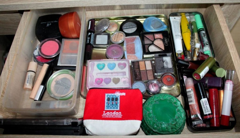 Pravý šuplík je věnovaný hlavně šminkám. Vlevo ve velké krabičce jsou věci na tváře a obličej: make-up, bronzery, tvářenky, korektory a pudr. Pak je sekce očních stínů: malé paletky a jednotlivé stíny. Jsou tam opřené pak i dvě větší paletky. Vpravo nahoře jsou řasenky, tužky na oči a rty. Dole pak mix rtěnek a lesků. Nakopnec tam mám malou makeup taštičku a keramickou mističku, tam zatím nic není. Snažím se postupně nahrazovat všechen make-up veganskými a netestovanými značkami.