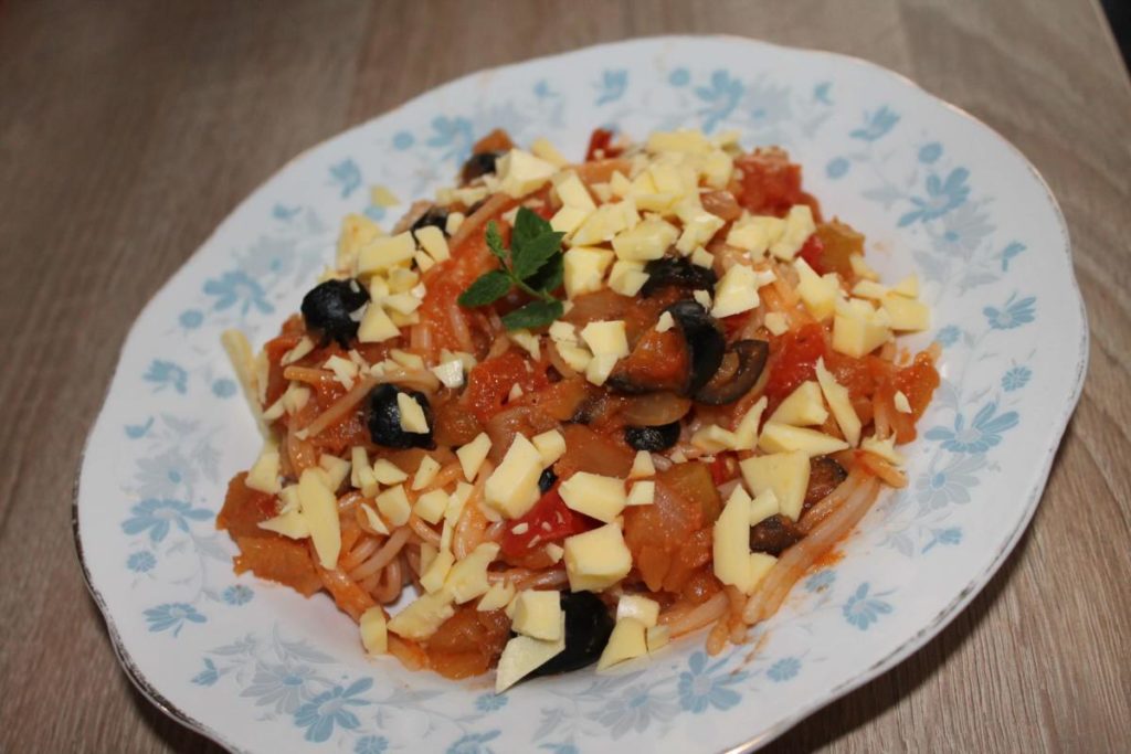Na oleji si osmažíte najemno nakrájenou cibuli, cuketu, rajčata a olivy. Vedle do hrnce si dáte vařit špagety podle návodu. Do pánvičky k zeleninové směsi nalijete půl hrníčku vody a 5 lžic rajského protlaku. Přidáte lžičku sušené bazalky, lžičku česneku a podle chuti sůl a pepř. Necháte bublat dokud se voda nevypaří a směs je hustá (cca 10 minut). Nakonec špagety promícháte se směsí a na talíři posypete veganským sýrem.