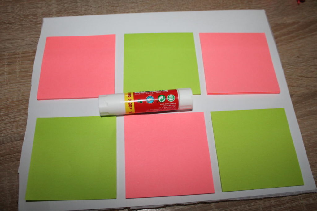 1. Na kus kartonu nalepíme čtvrtku a upravíme velikost aby se nám tam vešlo 6 lístečků.