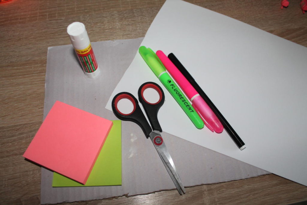 Připrav si: Karton, čtvrtku, barevné lepící lístečky, fixy, nůžky a lepidlo.