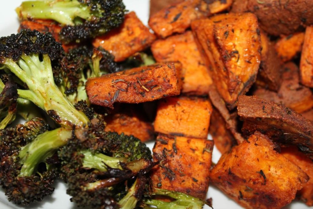 Batáty nakrájíme na kostky, brokolici rozdělíme na růžičky a dáme do misky. Pokapeme olejem, přidáme tymián, pepř a sůl. Směs poklademe na plech na pečící papír a pečeme v troubě na 200°C přibližně 45 minut (dokud nejsou batáty měkké). Čevapčiči je kupované, takže ho usmažíme podle návodu (cca 3 minuty na každé straně). Já si k tomu dávám trochu syrové cibule a různé omáčky. Tohle kombo bylo příjemnou změnou, ale vlastně vám k obědu stačí jen ta zelenina.