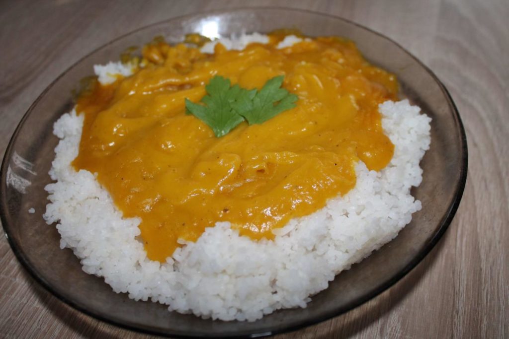 Rýži dáme uvařit podle návodu. Já doporučuji jasmínovou rýži dělanou v rýžovaru – ta je úžasná, ale stačí ji uvařit normálně v hrnci. Ve vedlejším hrnci si na oleji osmažíme najemno nakrájenou cibuli, přídáme na kostičky nakrájenou dýni a zalijeme 3 hrnky vody. Přidáme bujon, kari, sůl a pepř. Necháme vařit na středním plameni cca 30 minut (dokud není dýně měkká). Následně rozmixujeme do hladka, zalijeme sojovou smetanou a ještě 5 minut povaříme. Můžeme ještě přidat koření podle chuti. Omáčku podáváme s rýží.