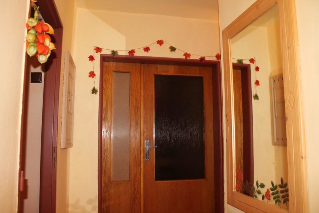 Chodbu jsem vyzdobila tím, co mi zbylo. Teda až na ty listy nad dveřmi, které jsem koupila přesně pro tento účel. Věnec na hlavních dvěřích mi také vyrobila mamka. Vše je laděno do podzimních barev a přírodních motivů.
