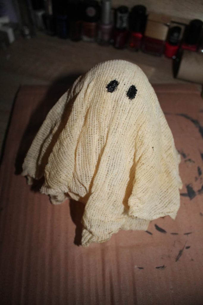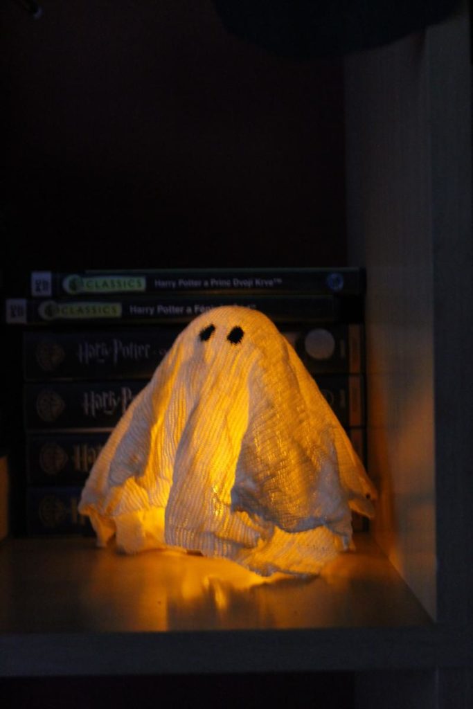 4. Temperou namalujeme oči a sestříhneme spodek, aby nám duch stál. Nakonec mě napadlo vložit zespoda elektrickou svíčku a bylo hotovo!