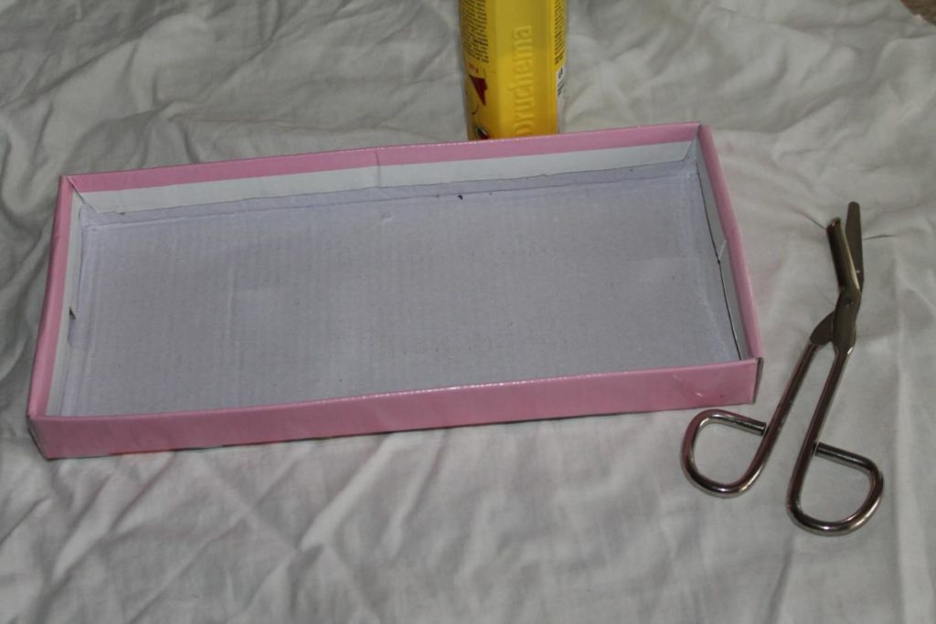 1. Víčko od krabice zabalíme do bílé látky a látku k ní přilepíme. Kratší okraje necháme delší a nepřilepené.