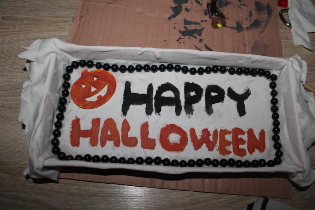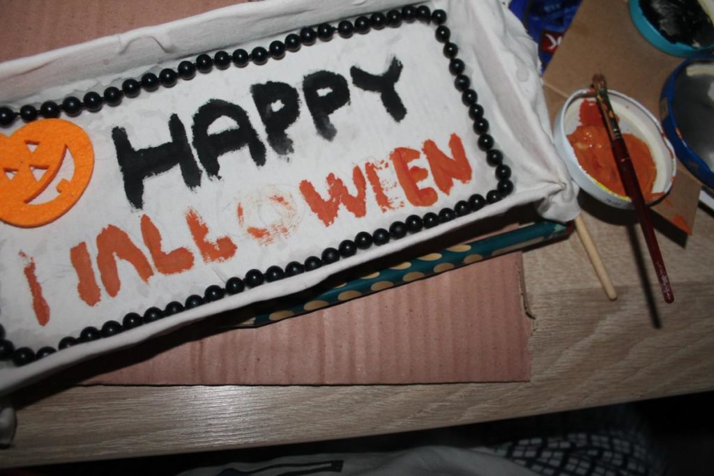 3. Okraje nastříháme, abychom jim dodaly vzhled „duchů“ a dýni přetřeme stejnou barvou jako nápis. Je hotovo!