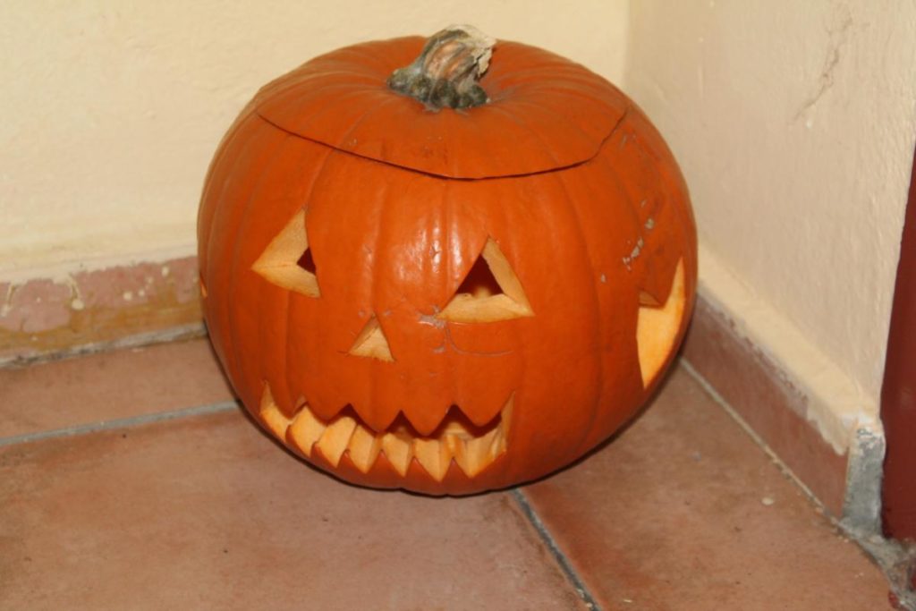 Samozřejmě jsem ani letos nevynechala dlabání dýně. Nebudu vám říkat, jak na to, protože jsem to již ukazovala v tomto článku, ale ukážu vám mojí letošní krásku. Doporučuji dovnitř dát svíčku na baterky a ne tu opravdickou – dýně déle vydrží. Také se ji lépe daří v chladnější místnosti. Já ji mám na chodbě.