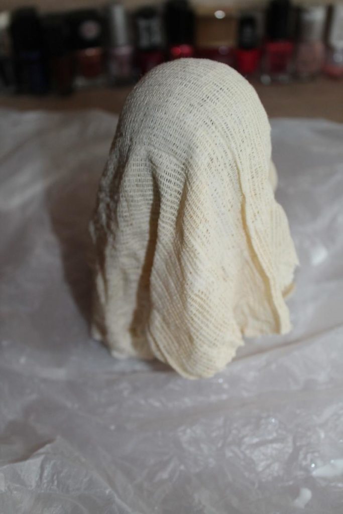3. Na ruličku dáme míček (to nám poslouží jako stojánek), dáme na igelitku a látku přes to pověsíme. Necháme zaschnout asi 4 hodiny.