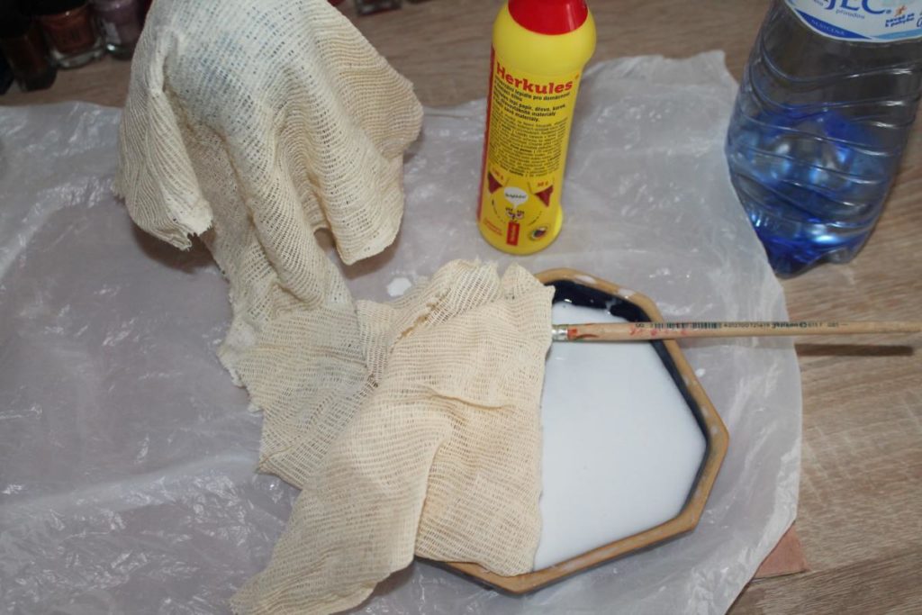 2. Lepidlo naředíme vodou (2 díly lepidla, 1 díl vody) a látku v tom namočíme.