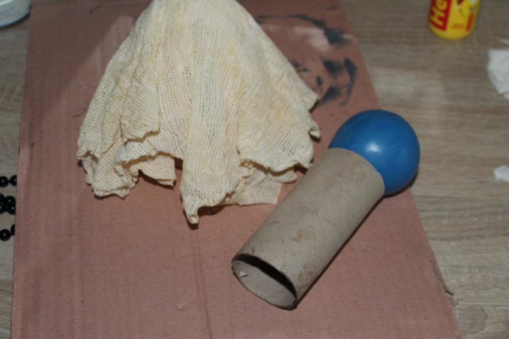 Připrav si: Roličku od toaletního papíru, míček, vodu, nůžky, štětce, igelitku, síťovanou látku (obvaz), černou temperu a lepidlo.