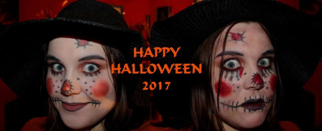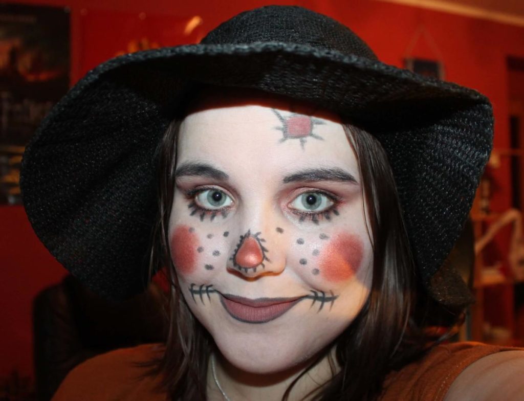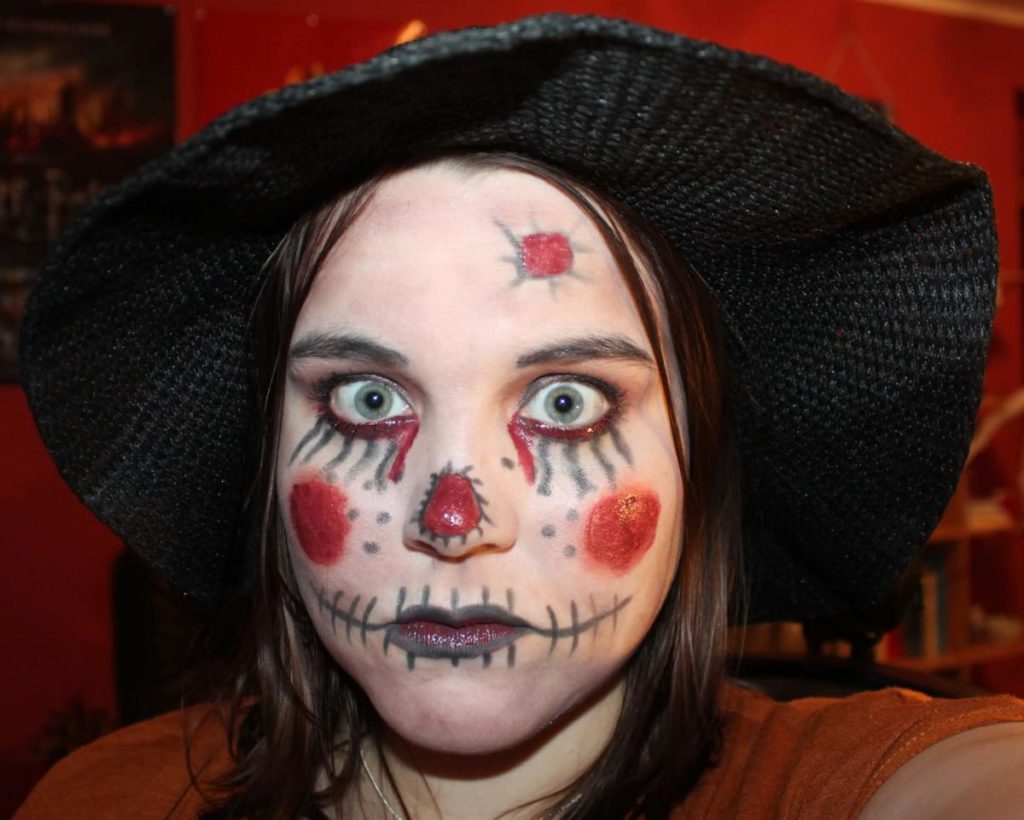 Mám sice docela světlou kůži, ale chtěla jsem docílit bezchybnosti, tak jsem smíchala trošku make-upu a bílé barvy na obličej. Oranžovými stíny na oči jsem si namalovala víčka a dolní linku. Černou tužkou jsem si pak udělala tenkou dolní linku, tak aby nepřekryla tolik stíny. Řasy jsem si namalovala černou řasenkou a tužkou trochu prodlužila ty dolní. Stíny jsem si namalovala i tváře a nos, který jsem obtáhla černou tužkou. Na rty jsem použila hnědou matnou rtěnku, obtáhla tužkou a domalovala strany. Stehy u pusy a nosu jsou také tužkou a to samé i pihy. Ještě jsem zapomněla na záplatu na čele. Namalovaná je tužkou a vyplněna hnědou rtěnkou. Vše jsem nakonec přepudrovala, aby se to tolik nelesklo. Pak stačí rozpustit vlasy a nasadit klobouk (světlejší by byl lepší).