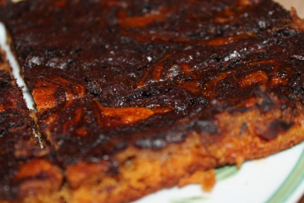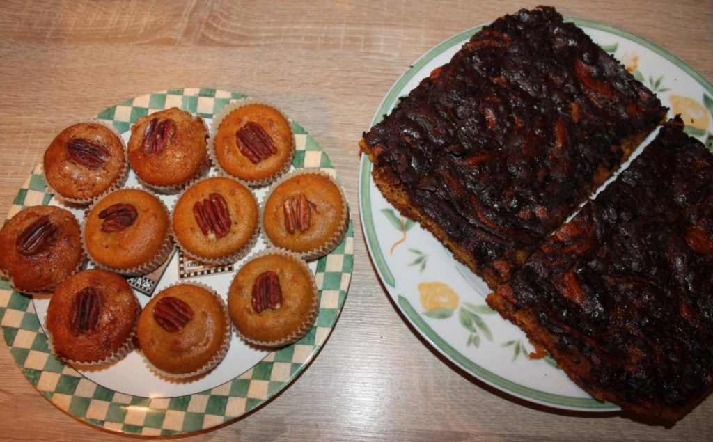 Smícháme půl hrnku dýňového pyré s lžičkou mixu koření, rýžovým sirupem a 3 lžícemi mléka. Čokoládu rozehřejeme s 2 lžícemi mléka a lžící oleje. Těsto uděláme jako u muffinů – smícháme suché ingredience a pak přidáme ty tekuté (ochucené dýňové pyré a čokoládu ne). Těsto vlijeme na plech, nahoru cik cak polijeme ochuceným pyré a čokoládou a pomocí lžišky lehce promícháme. Pečeme na 170°C přibližně 45 minut. Necháme vychladnout a podáváme.