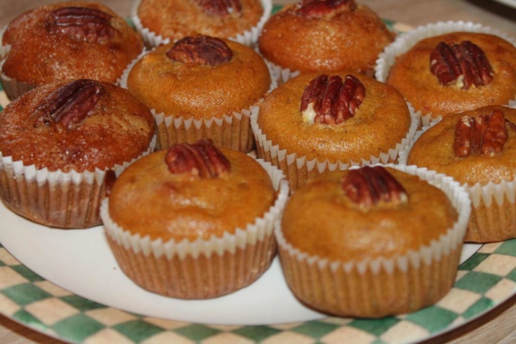 Smícháme suché ingredience a pak postupně přidáváme ty tekuté. Důkladně promícháme a necháme 10 minut odležet. Do formy na muffiny vložíme košíčky, naplníme těstem do půlky, zamáčkneme ořech, doplníme těsto do tří čtvrtin a nahoru dáme další oříšek. Pečeme na 180°C přibližně 20 minut. Necháme vychladnout a podáváme.