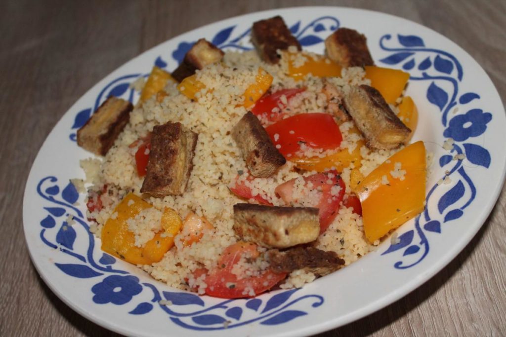 Kuskus s rajčaty, paprikou a osmaženým tofu posypané bazalkou.