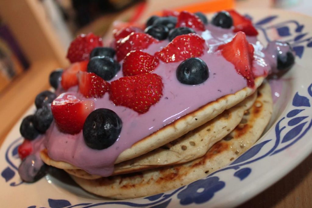 Palačinky se sojovým jogurtem a ovocem.
