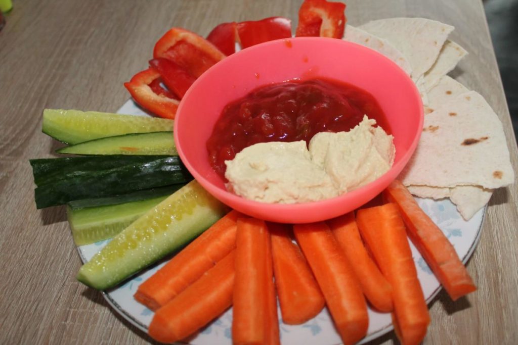 Zelenina, kukuřičná tortilla, hummus a salsa.