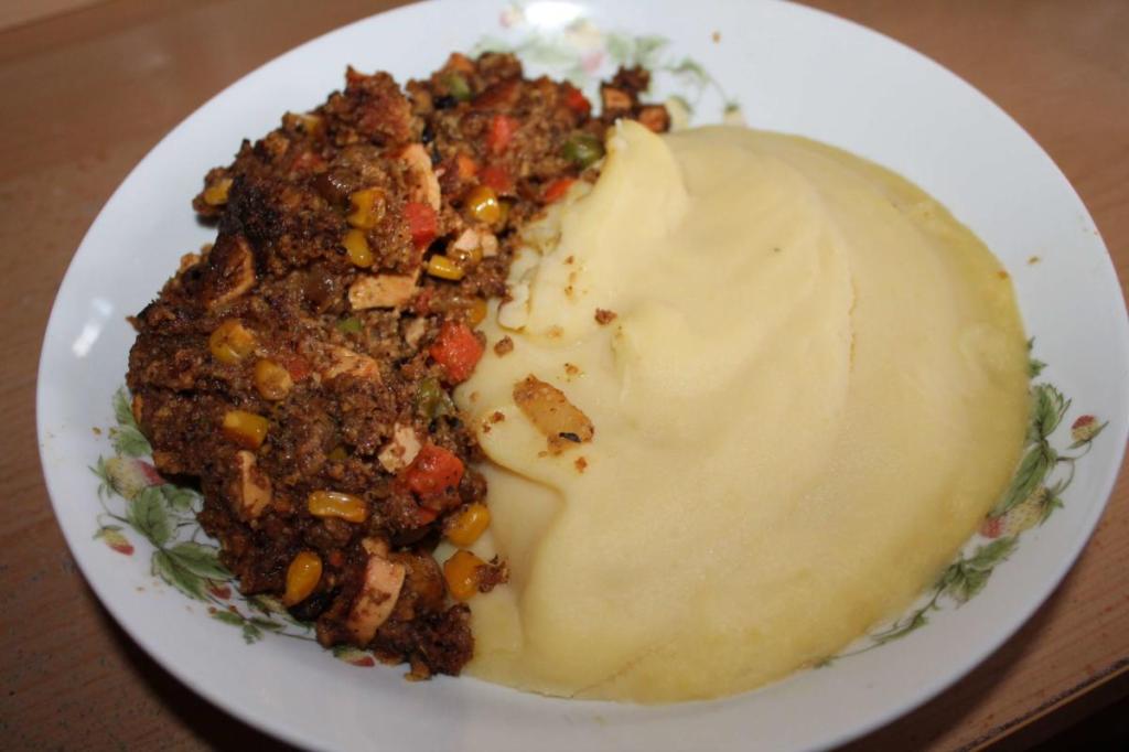 Směs ze sojového granulátu a zeleniny s bramborovou kaší.