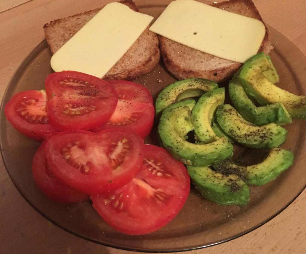 Tousty s vegan sýrem, rajčaty a avokádem.