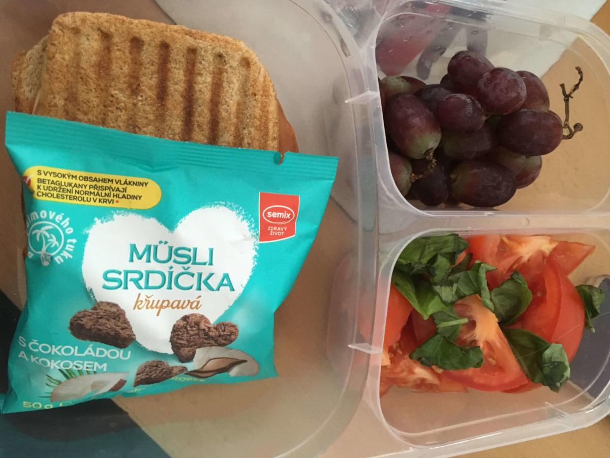 Toust, rajčata s bazalkou, hroznové víno a srdíčkové sušenky.