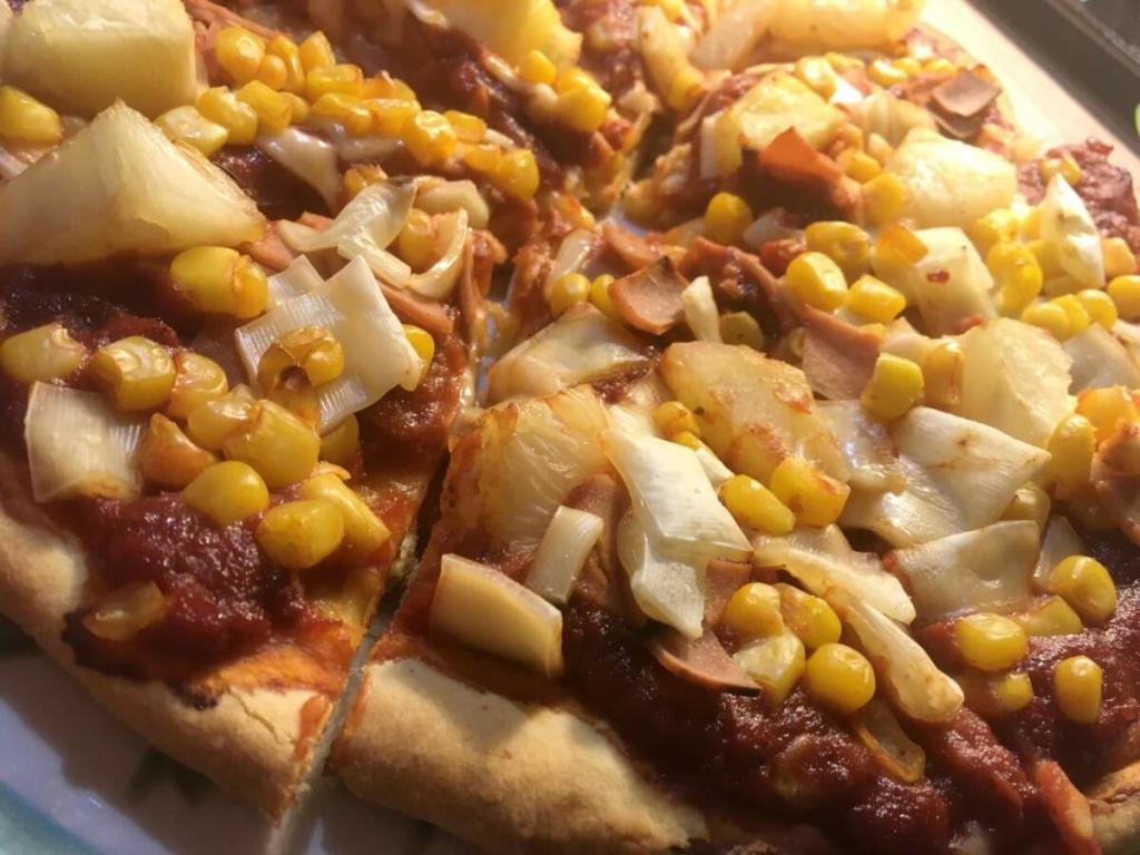 Samozřejmě na pizzu si můžete dát cokoliv, co máte rádi. Já zvolila „hawaii“, protože je má oblíbená. Masožrouti u mě doma si na to dali svoje ingredience a společné bylo těsto a omáčka. Je dobrá i druhý den studená.